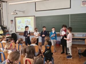 Drugaši su čuli posve druge priče – od Zimulje Grizulje do izgubljene ribice, a pokazali su i koliko znaju o čuvenim izumiteljima i umjetnicima. Uz Željkin dirigentski štapić zajedno su otpjevali pjesmu „Bratec Martin“ i to ne samo na hrvatskom nego i na francuskom, njemačkom, engleskom, a skoro i na kineskom!